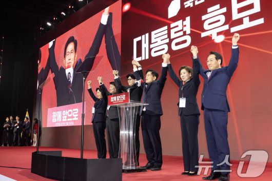 (고양=뉴스1) 김민지 기자 = 김문수 국민의힘 대통령 후보가 3일 오후 경기 고양시 킨텍스에서 열린 5차 전당대회에서 최종 후보로 확정된 뒤 기념 촬영하고 있다. 왼쪽부터 양향자, 안철수, 한동훈, 김문수, 나경원, 유정복. (공동취재) 2025.5.3/뉴스1