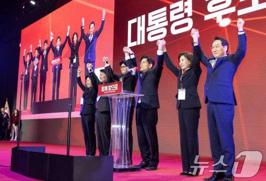 (고양=뉴스1) 김민지 기자 = 김문수 국민의힘 대통령 후보가 3일 오후 경기 고양시 킨텍스에서 열린 5차 전당대회에서 최종 후보로 확정된 뒤 기념 촬영하고 있다. 왼쪽부터 양향자, 안철수, 한동훈, 김문수, 나경원, 유정복. (공동취재) 2025.5.3/뉴스1