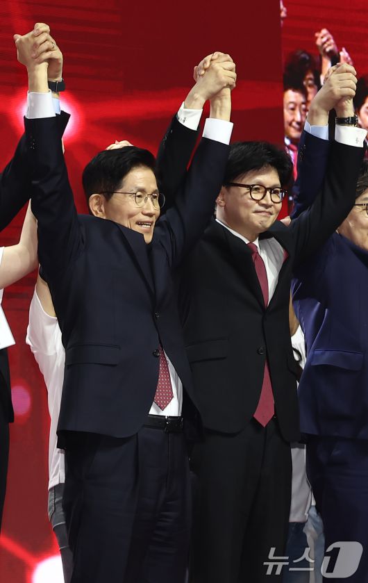 (고양=뉴스1) 김민지 기자 = 김문수 국민의힘 대통령 후보가 3일 경기 고양시 킨텍스에서 열린 5차 전당대회에서 최종 후보로 확정된 뒤 한동훈 후보와 함께 기념촬영을 하고 있다. 2025.5.3/뉴스1kimkim@news1.krCopyright ⓒ 뉴스1. All rights reserved. 무단 전재 및 재배포, AI학습 이용 금지.