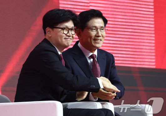 (고양=뉴스1) 김민지 기자 = 김문수 국민의힘 대통령 후보가 3일 경기 고양시 킨텍스에서 열린 5차 전당대회에서 최종 후보로 확정된 뒤 한동훈 후보의 축하를 받고 있다. 2025.5.3/뉴스1kimkim@news1.krCopyright ⓒ 뉴스1. All rights reserved. 무단 전재 및 재배포, AI학습 이용 금지.