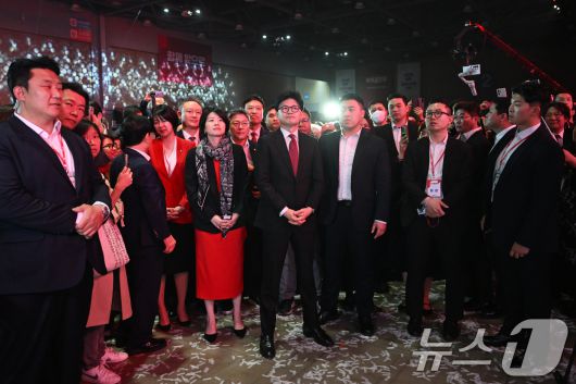(고양=뉴스1) 김민지 기자 = 한동훈 국민의힘 대선 경선 후보가 3일 경기 고양시 킨텍스에서 열린 제5차 전당대회에서 김문수 후보의 수락 연설을 바라보고 있다. (공동취재) 2025.5.3/뉴스1kimkim@news1.krCopyright ⓒ 뉴스1. All rights reserved. 무단 전재 및 재배포, AI학습 이용 금지.
