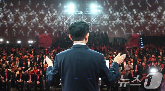 (고양=뉴스1) 김민지 기자 = 김문수 국민의힘 대통령 후보가 3일 경기 일산 킨텍스에서 열린 제5차 전당대회에서 최종 후보로 확정된 뒤 수락 연설을 하고 있다. (공동취재) 2025.5.3/뉴스1