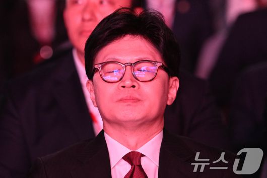 (고양=뉴스1) 김민지 기자 = 국민의힘 한동훈 대선 경선 후보가 3일 경기 일산 킨텍스에서 열린 제5차 전당대회에서 결과를 기다리고 있다. (공동취재) 2025.5.3/뉴스1
