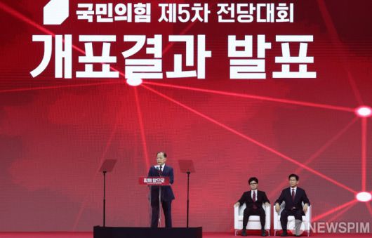 [고양=뉴스핌] 최지환 기자 = 황우여 국민의힘 선거관리위원장이 3일 오후 경기 고양시 킨텍스에서 열린 국민의힘 제5차 전당대회에서 개표결과를 발표하고 있다. 2025.05.03 choipix16@newspim.com
