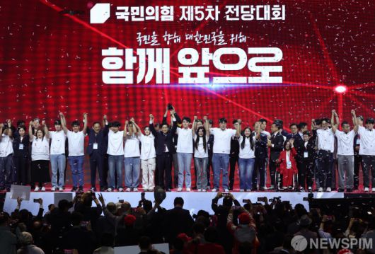 [고양=뉴스핌] 최지환 기자 = 국민의힘 대선후보로 선출된 김문수 후보가 3일 오후 경기 고양시 킨텍스에서 열린 국민의힘 제5차 전당대회에서 수락연설을 마치고 당 지도부와 감사인사를 하고 있다. 2025.05.03 choipix16@newspim.com