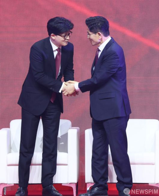 [고양=뉴스핌] 최지환 기자 = 국민의힘 대선후보로 선출된 김문수 후보가 3일 오후 경기 고양시 킨텍스에서 열린 국민의힘 제5차 전당대회에서 한동훈 후보와 대화하고 있다. 2025.05.03 choipix16@newspim.com
