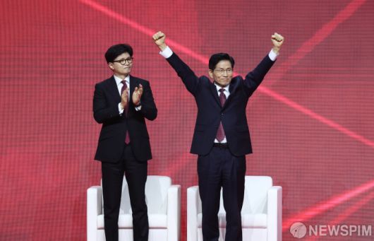 [고양=뉴스핌] 최지환 기자 = 국민의힘 대선후보로 선출된 김문수 후보가 3일 오후 경기 고양시 킨텍스에서 열린 국민의힘 제5차 전당대회에서 두 손 들어 감사인사를 하고 있다. 2025.05.03 choipix16@newspim.com