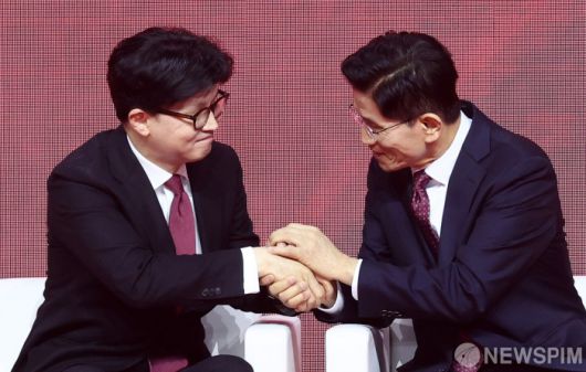 [고양=뉴스핌] 최지환 기자 = 국민의힘 대선후보로 선출된 김문수 후보가 3일 오후 경기 고양시 킨텍스에서 열린 국민의힘 제5차 전당대회에서 한동훈 후보 손을 잡아주고 있다. 2025.05.03 choipix16@newspim.com |
