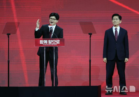 한 후보는 "저도 뒤에서 응원하겠다"며 "맑은 날도, 비 오는 날도, 눈 오는 날도 국민과 당원과 함께하겠다"고 했다. 그는 고개 숙여 인사한 뒤 최종 후보로 선출된 김문수 후보와 포옹을 나눴다.