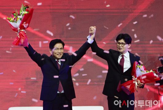 아시아투데이 이병화 기자 = 제21대 대통령선거 국민의힘 후보자로 선출된 김문수 후보가 3일 경기 고양시 킨텍스에서 열린 5차 전당대회에서 꽃다발을 받은 뒤 한동훈 후보와 함께 인사하고 있다. ⓒ "젊은 파워, 모바일 넘버원 아시아투데이"
