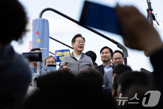 (삼척=뉴스1) 이재명 기자 = '골목골목 경청투어 : 동해안벨트편'에 나선 이재명 더불어민주당 대통령 후보가 3일 오후 강원 삼척시 삼척해수욕장에서 시민들을 향해 발언하고 있다. 2025.5.3/뉴스1