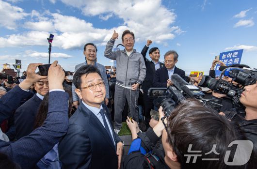 (삼척=뉴스1) 이재명 기자 = '골목골목 경청투어 : 동해안벨트편'에 나선 이재명 더불어민주당 대통령 후보가 3일 오후 강원 삼척시 삼척해수욕장에서 시민들에게 발언하기 전 엄지를 들어보이고 있다. 2025.5.3/뉴스12expulsion@news1.krCopyright ⓒ 뉴스1. All rights reserved. 무단 전재 및 재배포, AI학습 이용 금지.
