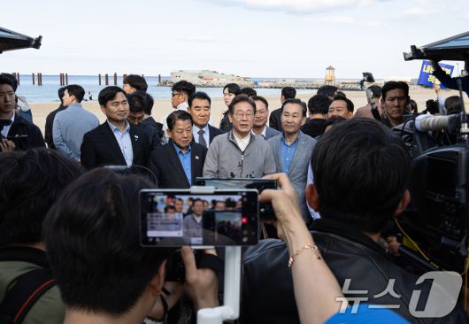 (삼척=뉴스1) 이재명 기자 = '골목골목 경청투어 : 동해안벨트편'에 나선 이재명 더불어민주당 대통령 후보가 3일 오후 강원 삼척시 삼척해수욕장에서 지지자들과 인사를 나눈 후 백브리핑을 하고 있다. 2025.5.3/뉴스1