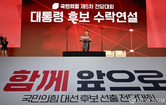 [서울=뉴스핌] 국회사진취재단 = 국민의힘 대선후보로 선출된 김문수 후보가 3일 오후 경기 고양시 킨텍스에서 열린 국민의힘 제5차 전당대회에서 수락연설을 하고 있다. 2025.05.03 photo@newspim.com
