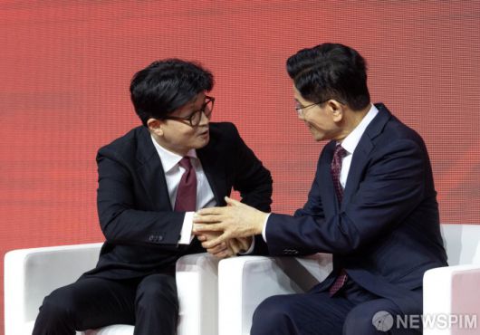 [서울=뉴스핌] 국회사진취재단 = 국민의힘 대선후보로 선출된 김문수 후보가 3일 오후 경기 고양시 킨텍스에서 열린 국민의힘 제5차 전당대회에서 한동훈 후보와 손을 잡고 있다. 2025.05.03 photo@newspim.com