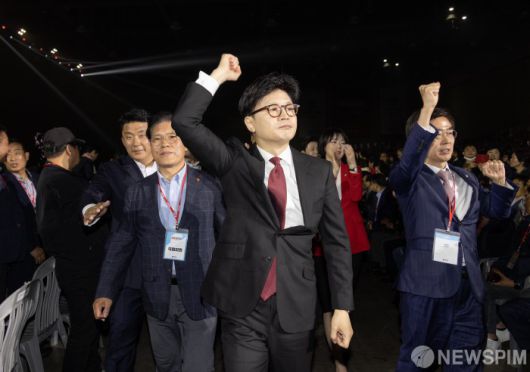 [서울=뉴스핌] 국회사진취재단 = 한동훈 국민의힘 대선 경선후보가 3일 오후 경기 고양시 킨텍스에서 열린 국민의힘 제5차 전당대회에 입장하고 있다. 2025.05.03 photo@newspim.com