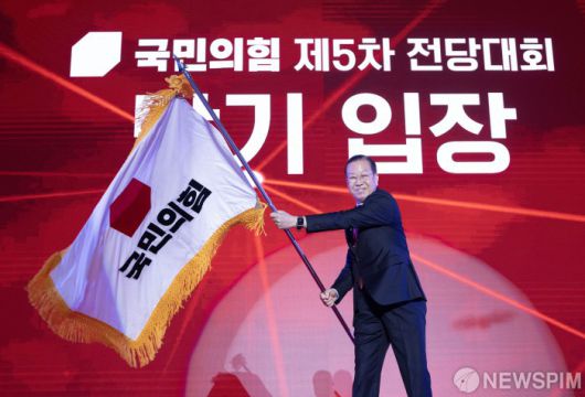 [서울=뉴스핌] 국회사진취재단 = 권영세 국민의힘 비대위원장이 3일 오후 경기 고양시 킨텍스에서 열린 21대 대통령선거 후보자 선출을 위한 제5차 전당대회에서 당기를 흔들고 있다. 2025.05.03 photo@newspim.com |