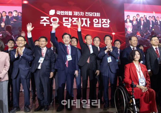 [이데일리 이영훈 기자] 김문수 국민의힘 대선 후보가 3일 오후 경기 고양시 킨텍스에서 열린 국민의힘 최종 대선 후보 선출을 위한 전당대회에서 후보로 선출된 뒤 지도부 등과 만세를 하고 있다.