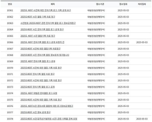 3일 대한민국 법원 사법정보공개포털의 '정보공개 청구 게시 목록'에 따르면 이날 오후 5시 30분 현재 '2025도 4697 사건(이 후보 선거법 위반 사건) 로그기록 정보 공개' 등 제목의 정보공개 청구 신청이 1만400건 넘게 접수됐다. 청구 내용은 거의 동일했다. 신청자들은 "이 후보 선거법 위반 사건은 매우 이례적이며 절차의 공정성과 정치적 중립성에 심각한 의문이 있다"며 "전자기록 열람자, 일시, 열람 문서 범위, 페이지 수 등을 공개를 청구하며 공개를 거부할 경우 반드시 구체적 조항과 이유를 명시해달라"고 공통적으로 요구했다.