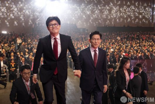 [서울=뉴스핌] 국회사진기자단 = 김문수, 한동훈 국민의힘 대선 경선 후보가 3일 오후 경기 고양시 킨텍스에서 열린 국민의힘 제5차 전당대회에서 함께 단상으로 향하고 있다. 2024.05.03 photo@newspim.com
