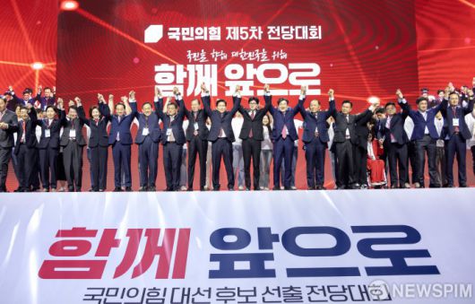[서울=뉴스핌] 국회사진기자단 = 국민의힘 대선후보로 선출된 김문수 후보가 3일 오후 경기 고양시 킨텍스에서 열린 국민의힘 제5차 전당대회에서 한동훈 후보, 국민의힘 지도부와 기념촬영을 하고 있다. 2024.05.03 photo@newspim.com