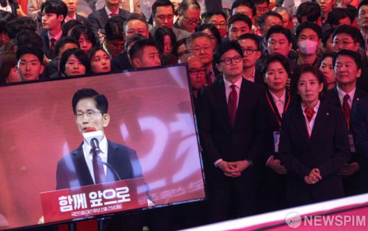 [서울=뉴스핌] 국회사진기자단 = 국민의힘 대선경선에서 탈락한 한동훈 후보가 3일 오후 경기 고양시 킨텍스에서 열린 국민의힘 제5차 전당대회에서 김문수 국민의힘 대선후보의 수락연설을 지켜보고 있다. 2024.05.03 photo@newspim.com
