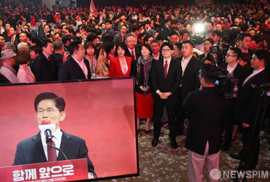 [서울=뉴스핌] 국회사진기자단 = 국민의힘 대선경선에서 탈락한 한동훈 후보가 3일 오후 경기 고양시 킨텍스에서 열린 국민의힘 제5차 전당대회에서 김문수 후보의 연설을 듣고 있다. 2024.05.03 photo@newspim.com