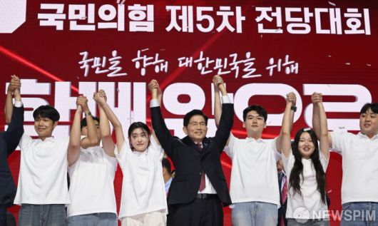 [서울=뉴스핌] 국회사진기자단 = 국민의힘 대선후보로 선출된 김문수 후보가 3일 오후 경기 고양시 킨텍스에서 열린 국민의힘 제5차 전당대회에서 한동훈 후보, 청년 당원들과 기념촬영을 하고 있다. 2024.05.03 photo@newspim.com