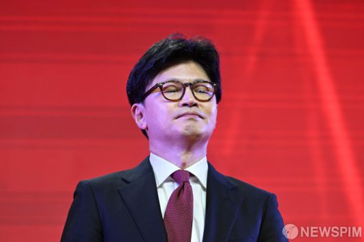 [서울=뉴스핌] 국회사진기자단 = 국민의힘 대선경선에서 탈락한 한동훈 후보가 3일 오후 경기 고양시 킨텍스에서 열린 국민의힘 제5차 전당대회에서 김문수 후보의 연설을 듣고 있다. 2024.05.03 photo@newspim.com
