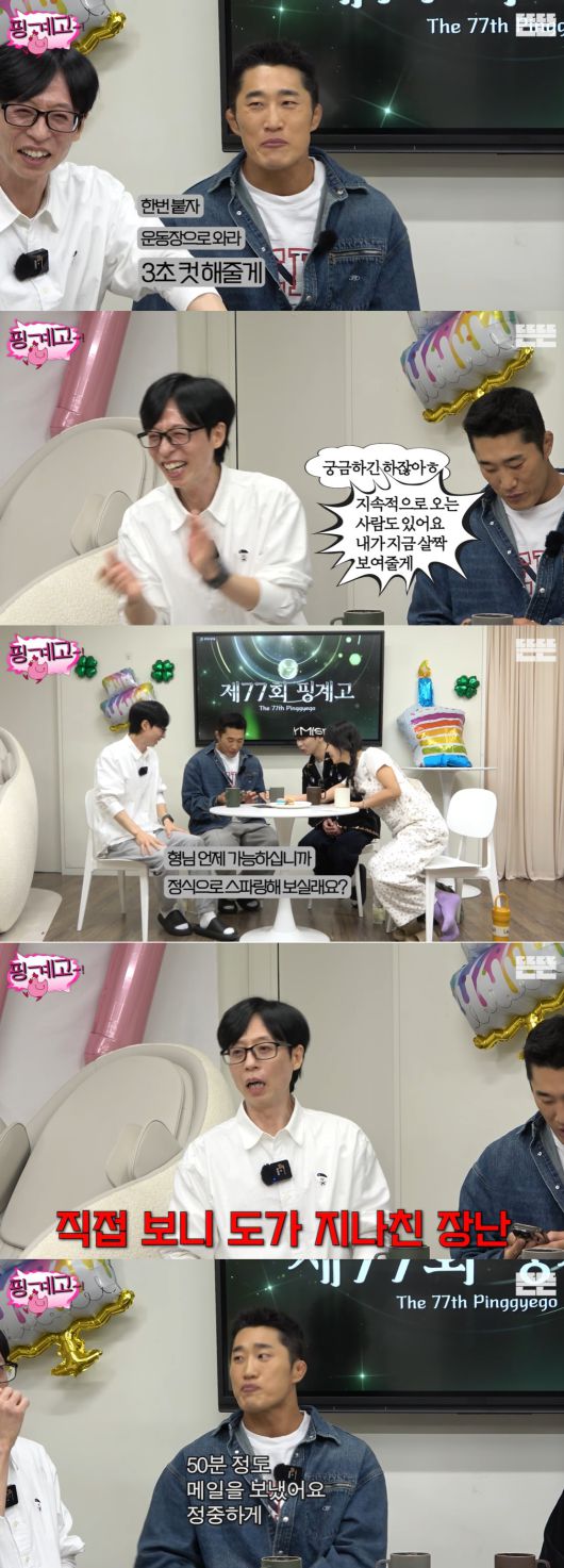김동현은 시비를 걸어온 메시지들을 하나하나 읽으며 "이런 게 너무 많이 온다. 이런 걸 한 번 방송에서 이야기했는데 그 뒤로 (시비 거는 메시지가) 너무 와서 궁금하더라. 콘텐츠로 모셔보겠다고 50분께 정중하게 메일을 보냈다. 압구정 체육관으로 와서 스파링이든 원하는 거 해드리겠다고 했다"고 고백했다.