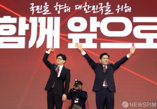 [서울=뉴스핌] 국회사진기자단 = 김문수, 한동훈 국민의힘 대선 경선 후보가 3일 오후 경기 고양시 킨텍스에서 열린 국민의힘 제5차 전당대회에 자리해 있다. 2024.05.03 photo@newspim.com