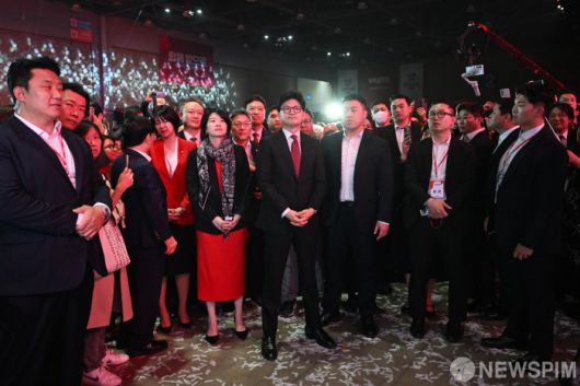 [서울=뉴스핌] 국회사진기자단 = 국민의힘 대선경선에서 탈락한 한동훈 후보가 3일 오후 경기 고양시 킨텍스에서 열린 국민의힘 제5차 전당대회에서 김문수 후보의 연설을 듣고 있다. 2024.05.03 photo@newspim.com |