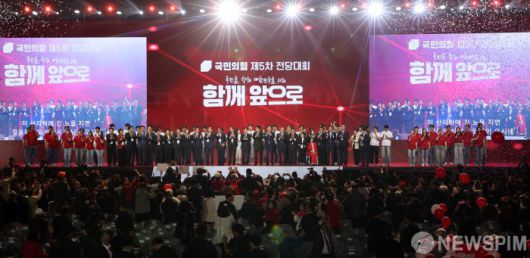 [고양=뉴스핌] 최지환 기자 = 국민의힘 대선후보로 선출된 김문수 후보가 3일 오후 경기 고양시 킨텍스에서 열린 국민의힘 제5차 전당대회에서 당직자들과 기념촬영을 하고 있다. 2025.05.03 choipix16@newspim.com