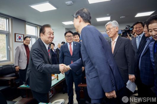 [서울=뉴스핌] 한덕수 대선후보가 3일 서울 여의도 국회 헌정기념관에서 정대철 헌정회장과 악수를 하고 있다. [사진=한덕수 캠프] 2025.05.03 photo@newspim.com