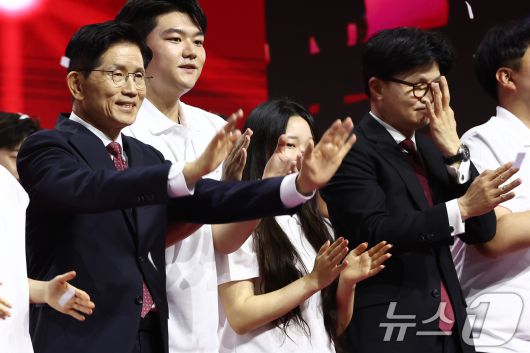 (고양=뉴스1) 김민지 기자 = 국민의힘 대통령 후보로 최종 확정된 김문수 후보가 3일 경기 고양시 킨텍스에서 열린 5차 전당대회에서 청년들과 기념촬영을 하고 있다. 오른쪽은 한동훈 후보. 2025.5.3/뉴스1kimkim@news1.krCopyright ⓒ 뉴스1. All rights reserved. 무단 전재 및 재배포, AI학습 이용 금지.