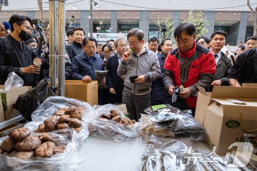 (태백=뉴스1) 이재명 기자 = '골목골목 경청투어 : 동해안벨트편'에 나선 이재명 더불어민주당 대통령 후보가 3일 오후 강원 태백시 장성탄탄마당 일원에서 열린 2025년 태백 천상의 산나물 축제장을 찾아 생어수리를 맛보고 있다. 2025.5.3/뉴스1