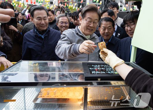 (태백=뉴스1) 이재명 기자 = '골목골목 경청투어 : 동해안벨트편'에 나선 이재명 더불어민주당 대통령 후보가 3일 오후 강원 태백시 장성탄탄마당 일원에서 열린 2025년 태백 천상의 산나물 축제장을 찾아 잉어빵을 손에 집고 있다. 2025.5.3/뉴스1