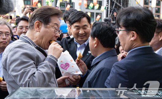 (태백=뉴스1) 이재명 기자 = '골목골목 경청투어 : 동해안벨트편'에 나선 이재명 더불어민주당 대통령 후보가 3일 오후 강원 태백시 장성탄탄마당 일원에서 열린 2025년 태백 천상의 산나물 축제장을 찾아 잉어빵을 맛보고 있다. 2025.5.3/뉴스1
