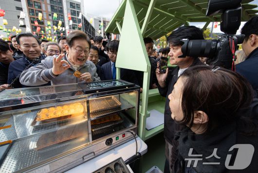(태백=뉴스1) 이재명 기자 = '골목골목 경청투어 : 동해안벨트편'에 나선 이재명 더불어민주당 대통령 후보가 3일 오후 강원 태백시 장성탄탄마당 일원에서 열린 2025년 태백 천상의 산나물 축제장에서 잉어빵 상인과 대화를 하고 있다. 2025.5.3/뉴스1
