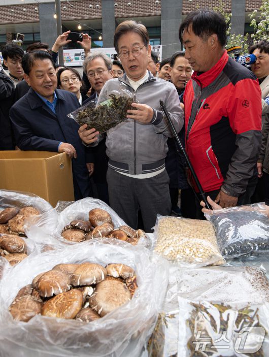 (태백=뉴스1) 이재명 기자 = '골목골목 경청투어 : 동해안벨트편'에 나선 이재명 더불어민주당 대통령 후보가 3일 오후 강원 태백시 장성탄탄마당 일원에서 열린 2025년 태백 천상의 산나물 축제장에서 나물 등을 구입하고 있다. 2025.5.3/뉴스1
