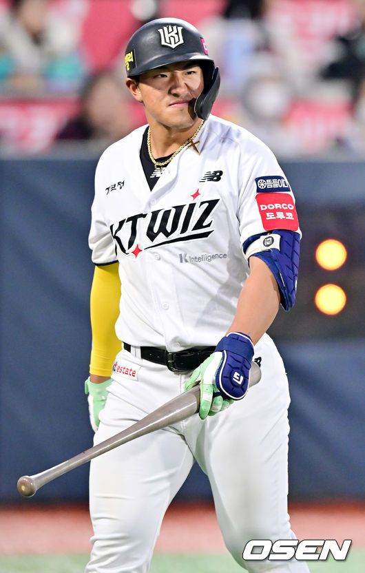 [OSEN=수원, 민경훈 기자] 3일 오후 수원 KT위즈파크에서 ‘2025 신한 SOL Bank KBO리그’ KT 위즈와 키움 히어로즈의 경기가 열렸다. 홈팀 KT는 오원석, 원정팀 키움은 하영민을 선발로 내세웠다. 7회말 2사 주자 2,3루 KT 안현민이 자신이 때린 파울타구에 맞은 후 고통을 호소하며 교체되고 있다. 2025.05.03 / rumi@osen.co.kr