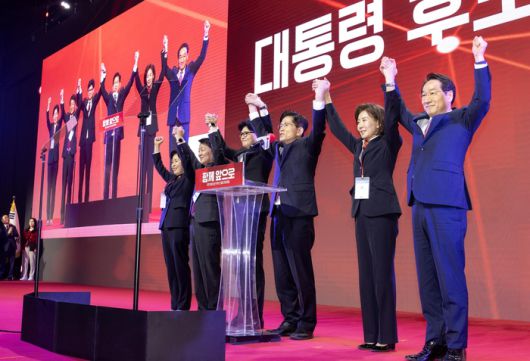 민의힘 대선 후보로 선출된 김문수 후보(왼쪽 네번째)가 3일 경기 고양시 킨텍스에서 열린 국민의힘 전당대회에서 후보들과 손을 들어올리고 있다. 왼쪽부터 양향자, 안철수, 한동훈, 김문수, 나경원, 유정복 후보. [공동취재] |