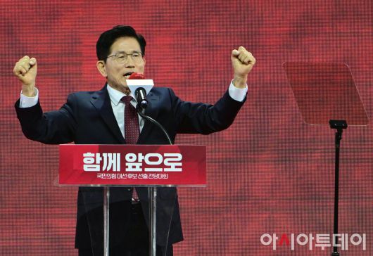 아시아투데이 이병화 기자 = 제21대 대통령선거 국민의힘 후보자로 선출된 김문수 후보가 3일 경기 고양시 킨텍스에서 열린 5차 전당대회에서 수락 연설을 하고 있다.