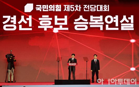 아시아투데이 이병화 기자 = 한동훈 국민의힘 대선 경선 후보가 3일 경기 고양시 킨텍스에서 열린 5차 전당대회에서 승복 연설을 하고 있다. 오른쪽은 제21대 대통령선거 국민의힘 후보자로 선출된 김문수 후보. ⓒ "젊은 파워, 모바일 넘버원 아시아투데이"