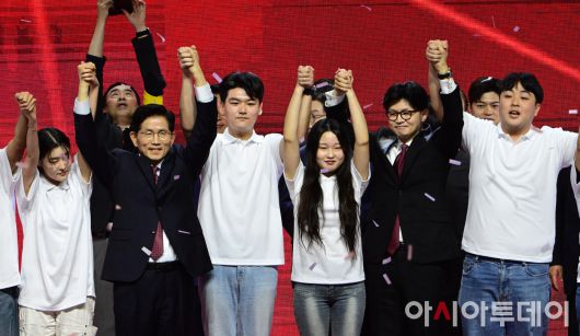 아시아투데이 이병화 기자 = 제21대 대통령선거 국민의힘 후보자로 선출된 김문수 후보가 3일 오후 경기 고양시 킨텍스에서 열린 5차 전당대회에서 최종 후보로 확정된 뒤 청년들과 기념촬영을 하고 있다. ⓒ "젊은 파워, 모바일 넘버원 아시아투데이"