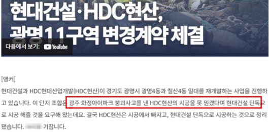 광명11구역은 현대건설과 HDC현산 컨소시엄이 시공을 맡았는데, 조합에서 붕괴사고를 낸 HDC현산의 시공을 못믿겠다며 현대건설 단독으로 시공해줄 것을 요구했다.