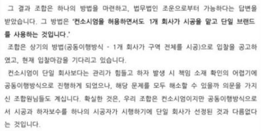 신당10구역 조합은 최근 조합원에게 "컨소시엄을 허용하면서도 1개 회사가 시공을 맡고 단일 브랜드를 사용하는 방법이 있다"며 "조합은 이 방법으로 입찰을 공고했고, 컨소시엄이지만 공동이행방식으로서 시공과 하자보수를 하나의 시공자가 시행하기에 단일 회사가 선정된 것과 다름없다"고 설명했다.