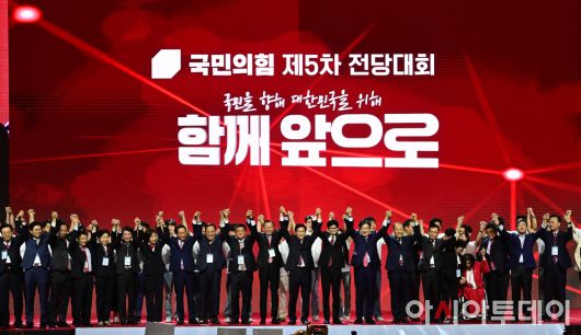 아시아투데이 이병화 기자 = 제21대 대통령선거 국민의힘 후보자로 선출된 김문수 후보가 3일 경기 고양시 킨텍스에서 열린 5차 전당대회에서 수락 연설을 마친 뒤 당지도부 및 주요 당직자들과 손을 맞잡아 들어보이며 인사하고 있다. ⓒ "젊은 파워, 모바일 넘버원 아시아투데이"