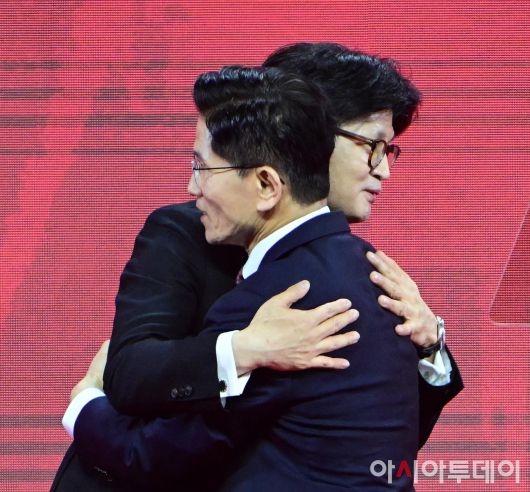 아시아투데이 이병화 기자 = 제21대 대통령선거 국민의힘 후보자로 선출된 김문수 후보와 한동훈 경선 후보가 3일 경기 고양시 킨텍스에서 열린 5차 전당대회에서 각각 수락 연설과 승복 연설을 마친 뒤 포옹하고 있다. ⓒ "젊은 파워, 모바일 넘버원 아시아투데이"