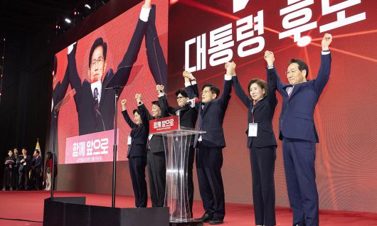 국민의힘 대선 후보로 선출된 김문수 후보(왼쪽 네번째)가 3일 경기 고양시 킨텍스에서 열린 국민의힘 전당대회에서 후보들과 손을 들어올리고 있다. 왼쪽부터 양향자, 안철수, 한동훈, 김문수, 나경원, 유정복 후보. 공동취재 |